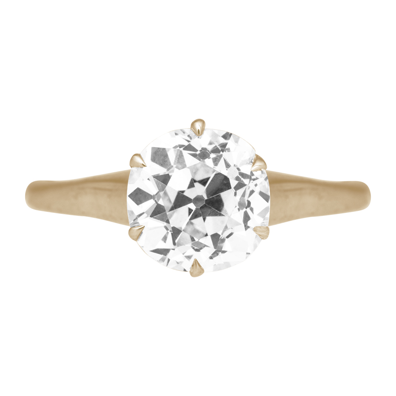 Antique 14k yellow gold solitaire ring centered with a 1.77 carat old mine diamond.