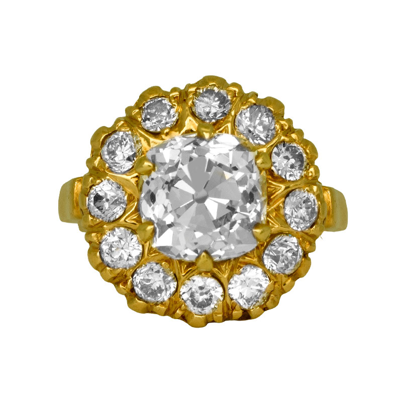 Antique 14k yellow gold halo ring centered with a 3.80 carat Old Mine diamond surrounded by 1.30 carats of old European diamonds.