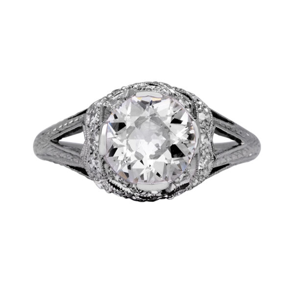 Antique Art Deco platinum engraved engagement ring centered with a 1.55 carat Old European diamond surrounded by 0.36 carats of single cut diamonds.