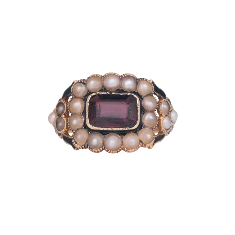 Antique Georgian 18k yellow gold halo ring centered with a 1.62 carat emerald cut garnet surrounded by a halo of 2.25mm seed pearls.