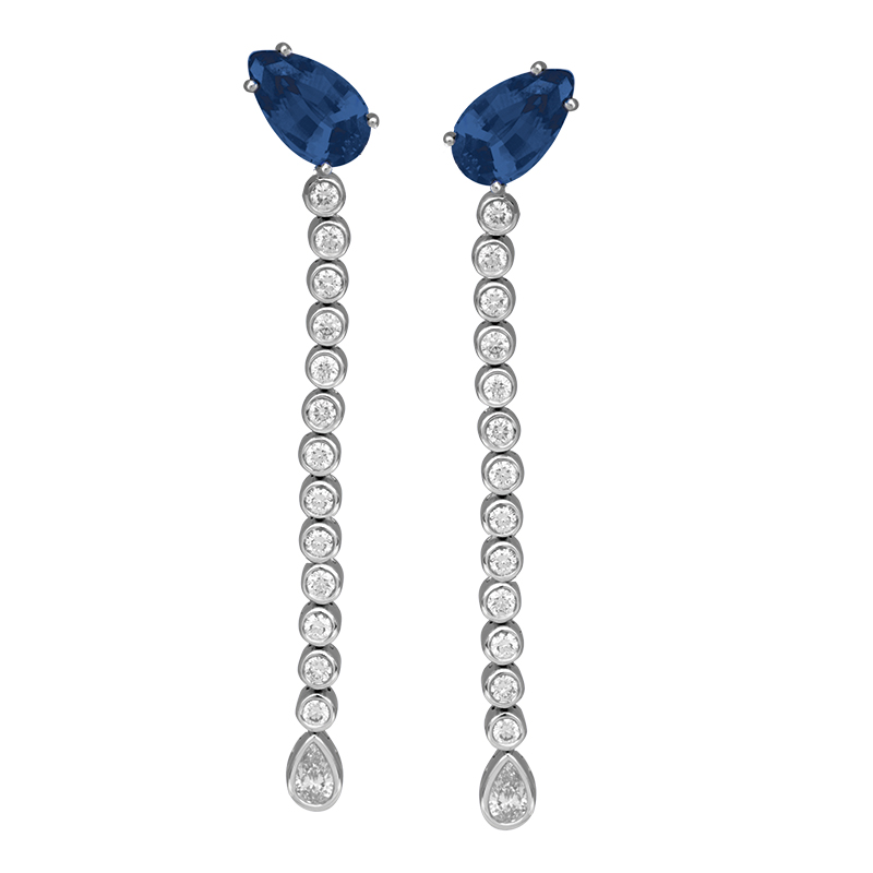 New 18k white gold Chatham dangle earrings set with 4.26 carats of lab-grown pear sapphires & 1.08 carats of lab-grown round brilliant diamonds.