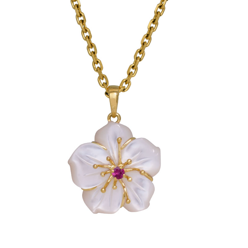 New 14k yellow gold Denny Wong Pa’Uohi’Iaka pendant carved in mother-of-pearl and set with a 0.06 carat round brilliant ruby.
