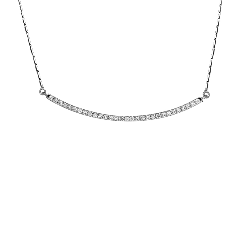 New 14k white gold curved bar pendant set with 0.24 carats of round brilliant diamonds on an adjustable fancy link chain.