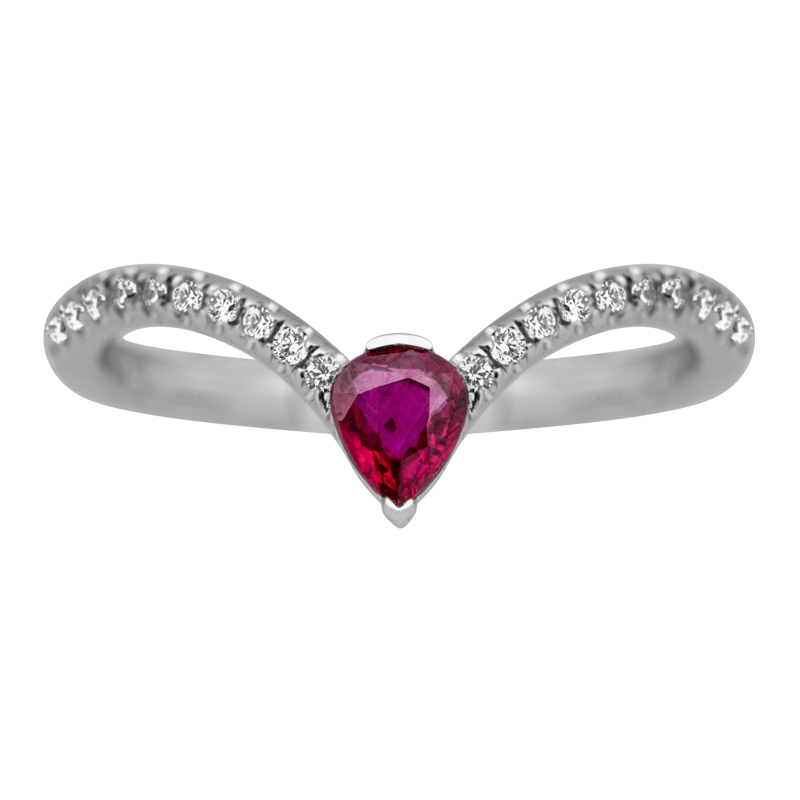 New 18k white gold curved band set with a 0.15 carat pear ruby & 0.33 carats of round brilliant diamonds.