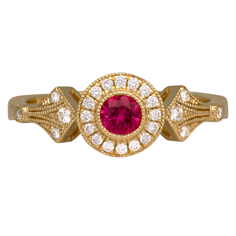 New 14k yellow gold halo ring centered with a 0.30 carat round brilliant ruby surrounded by 0.18 carats of round brilliant diamonds.