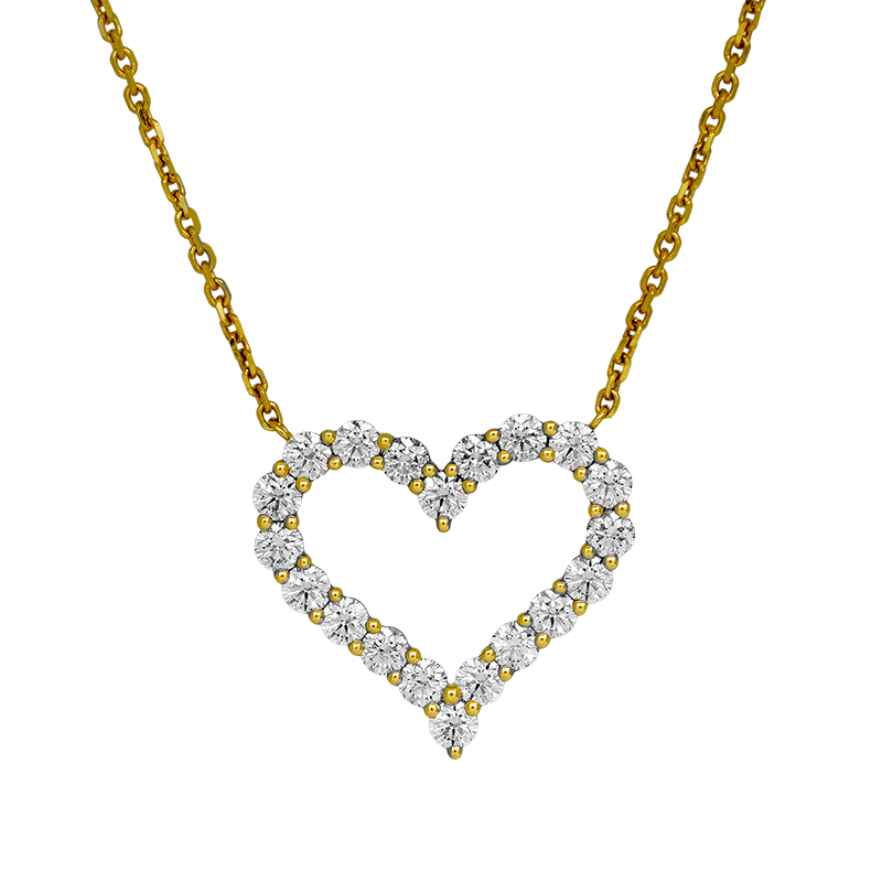 New 14k yellow gold open heart necklace set with 0.92 carats of lab-grown round brilliant diamonds on a 16″ chain.