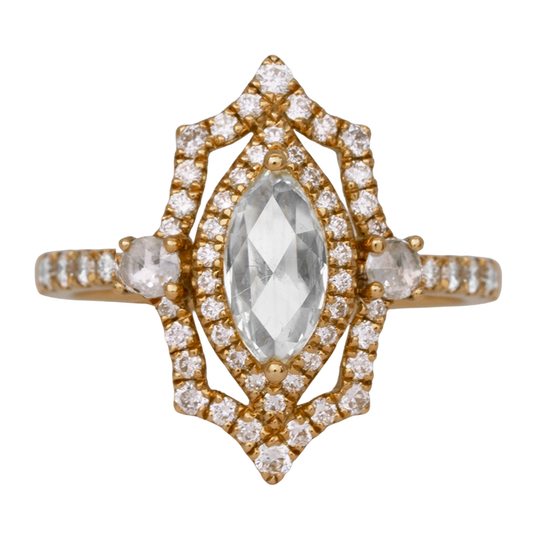 New 18k yellow gold marquise halo ring centered with a 0.70 carat rose cut marquise diamond surrounded by 0.37 carats of round brilliant & rose cut diamonds in the haloes & band.
