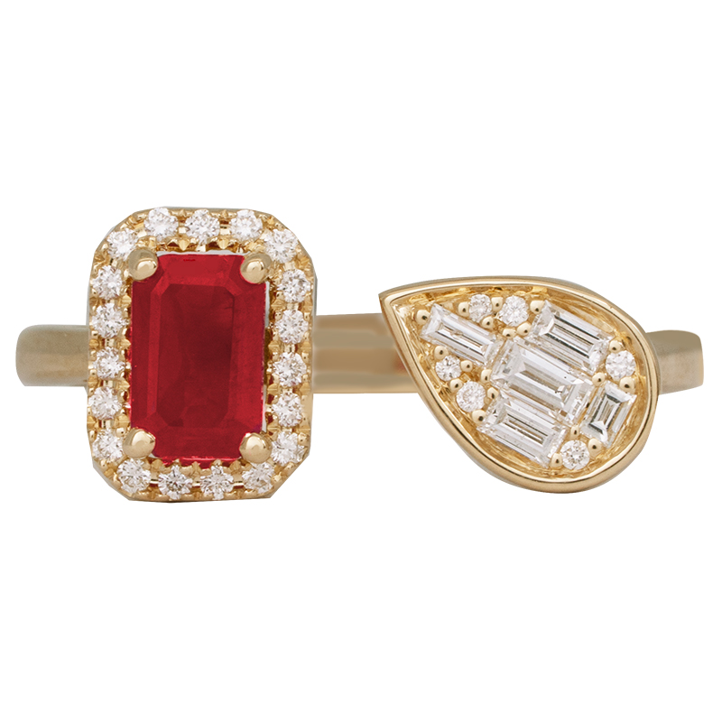 New 14k yellow gold halo open ring set with a 0.82 carat emerald cut ruby & 0.32 carats of round brilliant & baguette diamonds.