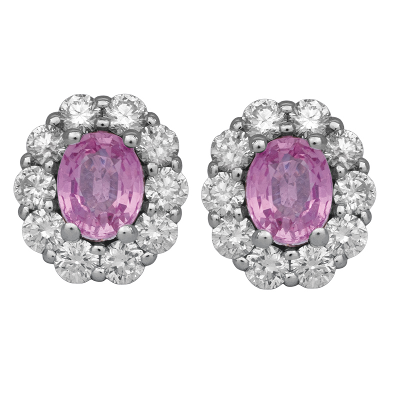 New 14k white gold halo earrings centered with 0.81 carats of oval pink sapphires surrounded by 0.65 carats of round brilliant diamonds.