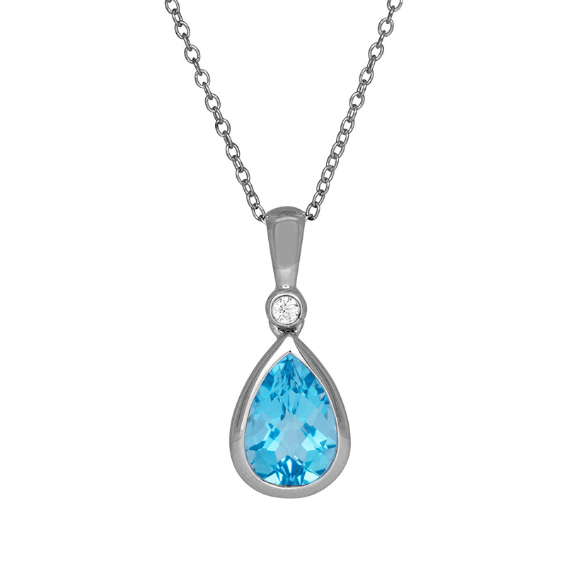 New 14k white gold pendant set with a 1.45 carat pear blue & a 0.02 carat round brilliant diamond.