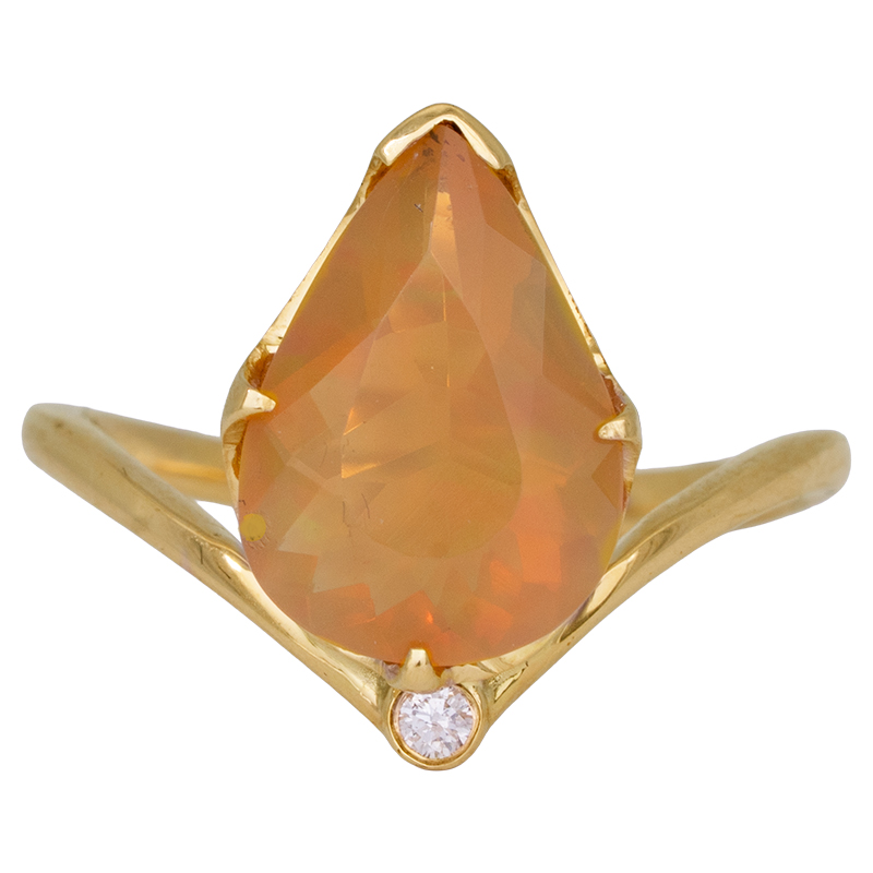 New 18k yellow gold ring set with a 1.71 carat pear opal & a 0.02 carat round brilliant diamond.