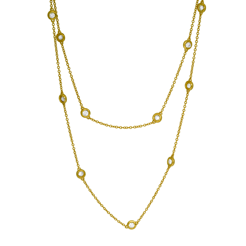 New 18k yellow gold station necklace set with 2.04 carats of round brilliant diamonds on a 36″ chain.
