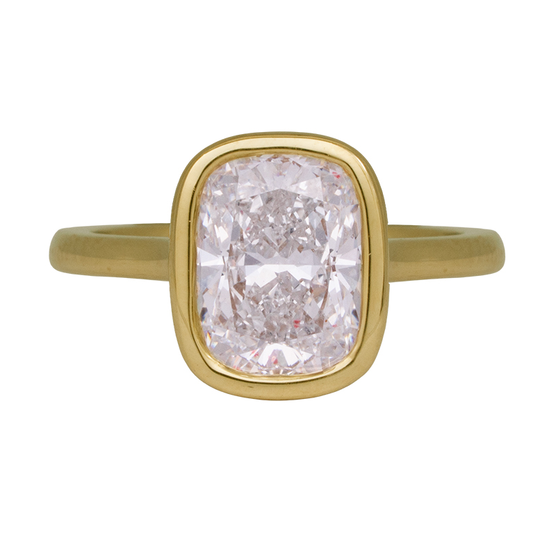 New 14k yellow gold solitaire engagement ring set with a 2.08 carat lab-grown cushion diamond.