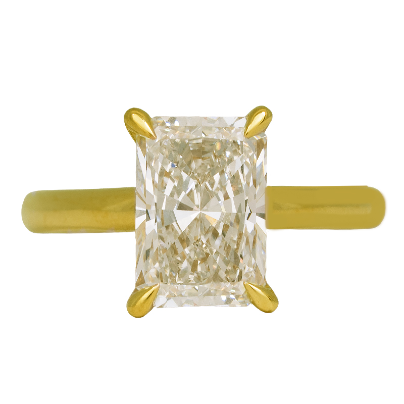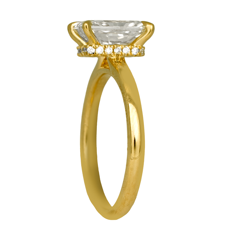 New 14k yellow gold engagement ring centered with a 2.03 carat lab-grown radiant diamond surrounded by a 0.07 carat lab-grown round brilliant diamond under-halo (can only be seen from the side of the ring, under the center stone).