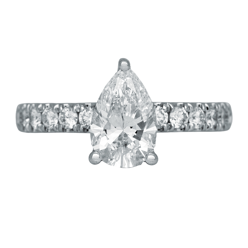 New 14k white gold under-halo engagement ring set with a 1.50 carats lab-grown pear diamond & 0.63 carats of round brilliant diamonds in the under-halo & band.