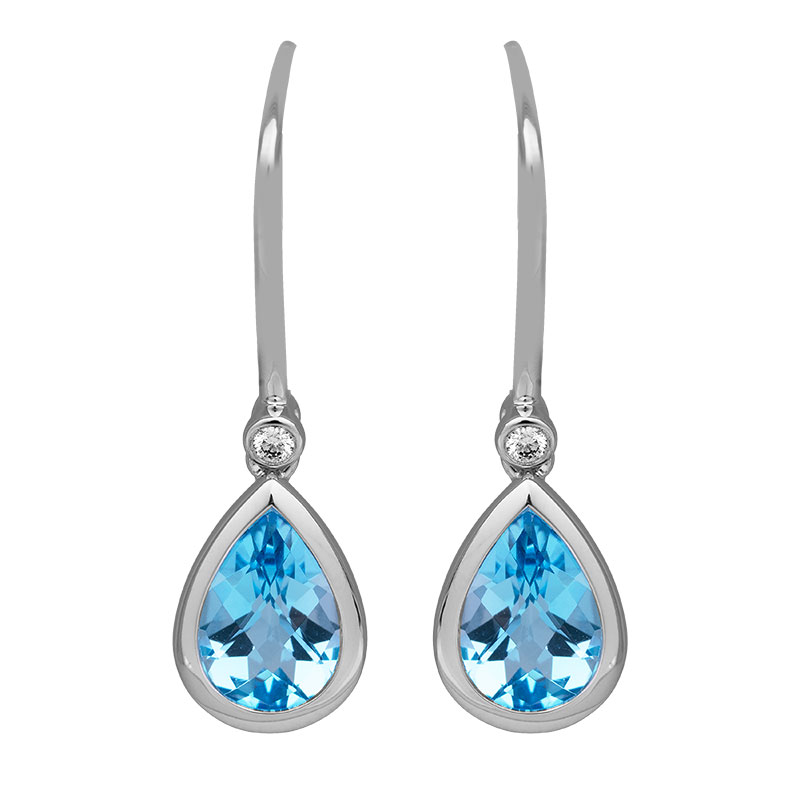 New 14k white gold drop earrings set with 2.09 carats of pear blue topaz & 0.05 carats of round brilliant diamonds.
