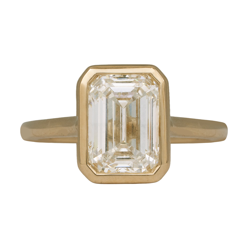 New 14k yellow gold solitaire engagement ring set with a 2.25 carat lab-grown emerald cut diamond.