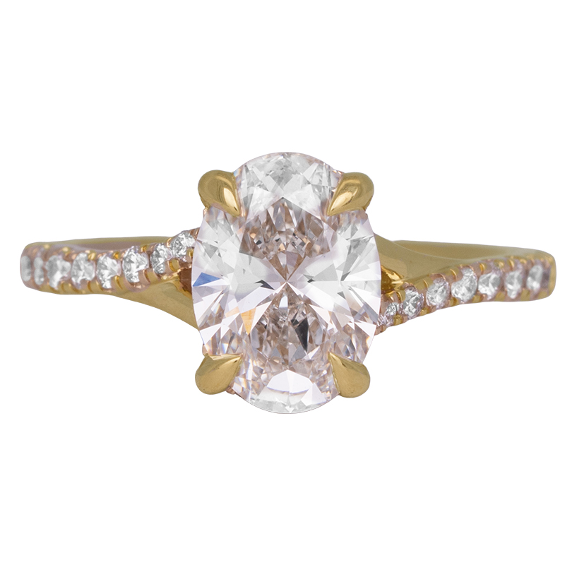 New 14k yellow gold under-halo engagement ring centered with a 2.01 carat lab-grown oval diamond surrounded by 0.25 carats of lab-grown round brilliant diamonds in the under-halo & band.