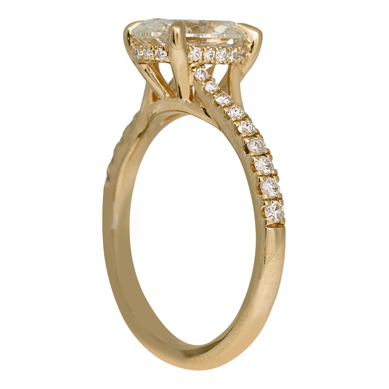 New 14k yellow gold engagement ring centered with a 2.03 carat lab-grown oval diamond surrounded by 0.23 carats of lab-grown round brilliant diamonds in the under-halo & band.