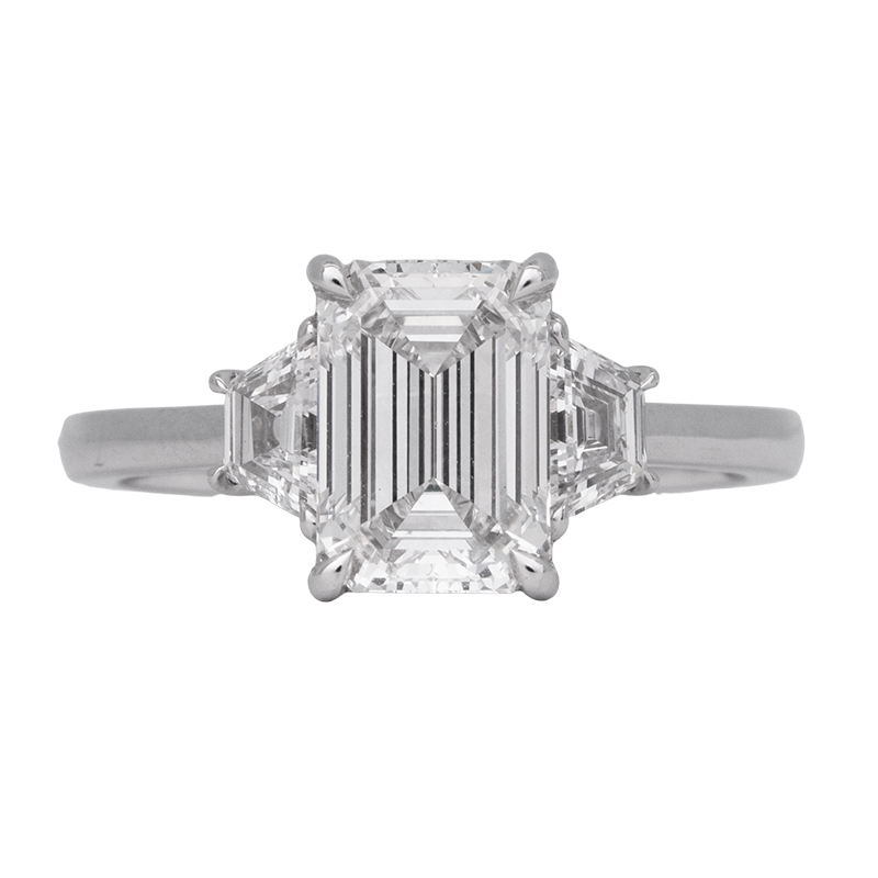 New 14k white gold 3-stone engagement ring centered with a 2.00 carat lab-grown diamond flanked by 0.50 carats of lab-grown trapezoid diamonds.