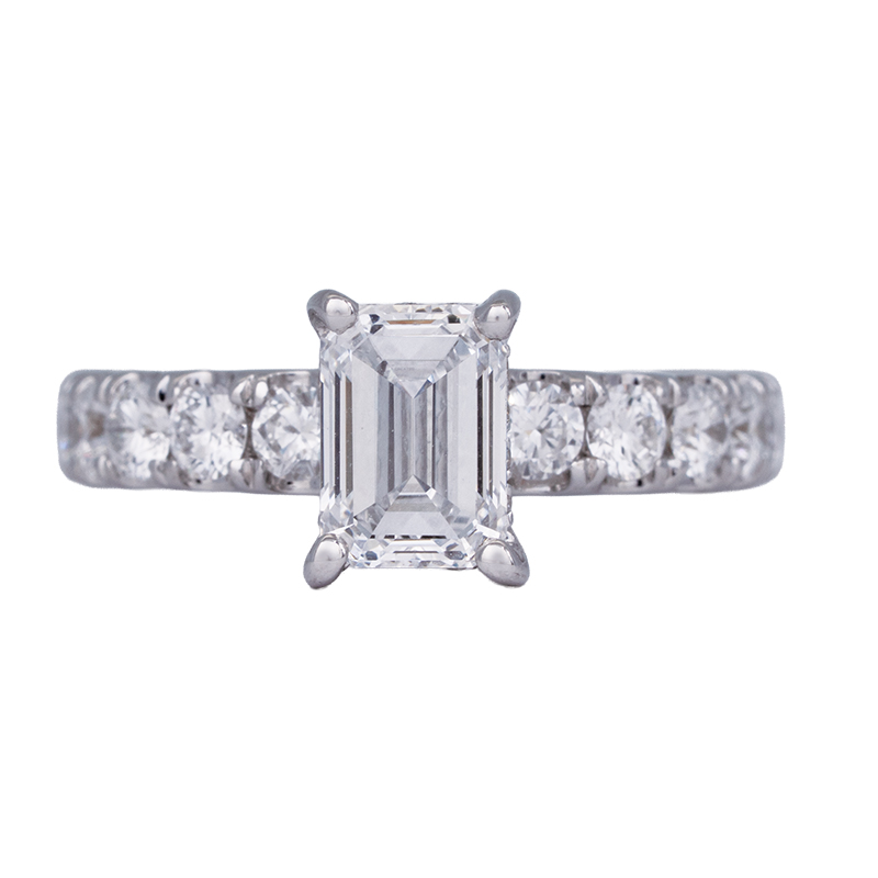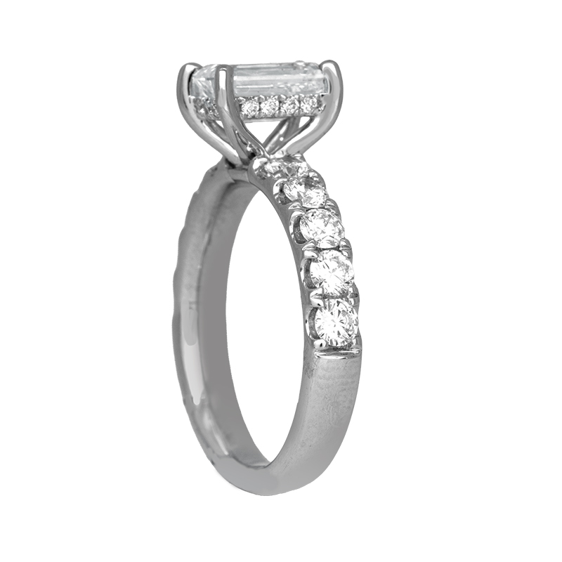 New 14k white gold under-halo engagement ring set with a 1.50 lab-grown emerald cut diamond & 1.03 carats of lab-grown round brilliant diamonds in the under-halo & band.