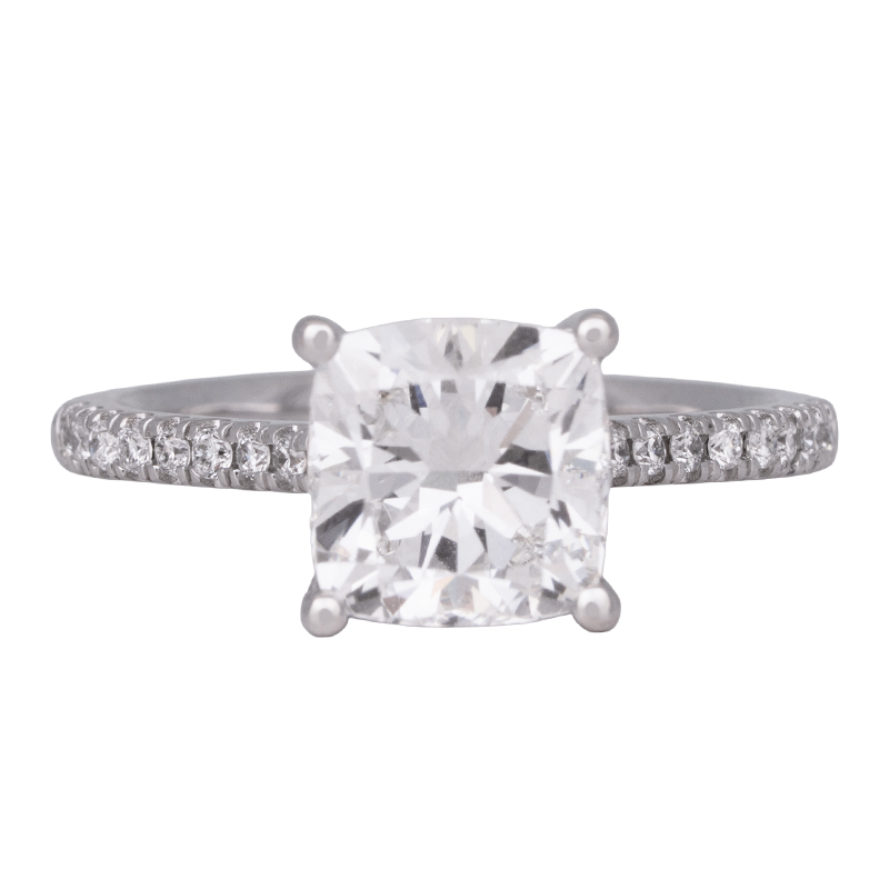 New 14k white gold under-halo engagement ring centered with a 2.53 carats lab-grown cushion diamond surrounded by 0.22 carats of lab-grown round brilliant diamonds in the under-halo & band.