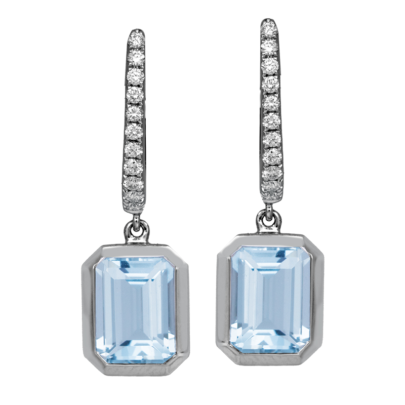 New 14k white gold huggie drop earrings set with 2.96 carats of emerald cut aquamarines & 0.19 carats of round brilliant diamonds.