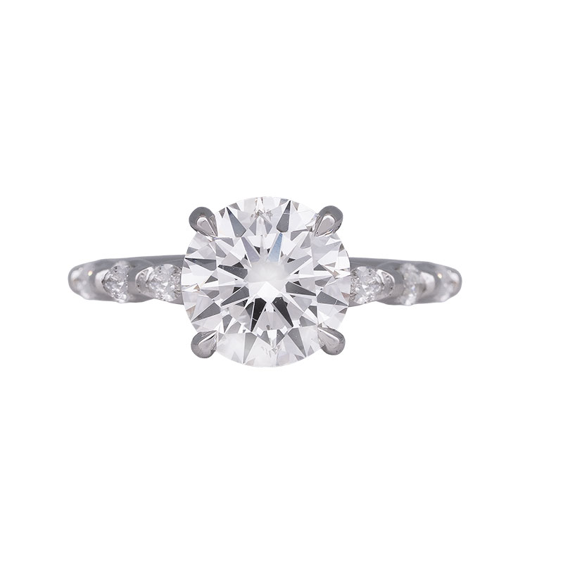 New 14k white gold engagement ring set with a 3.02 carat lab-grown round brilliant diamond & 0.37 carats of lab-grown marquise & round brilliant diamonds in the band.