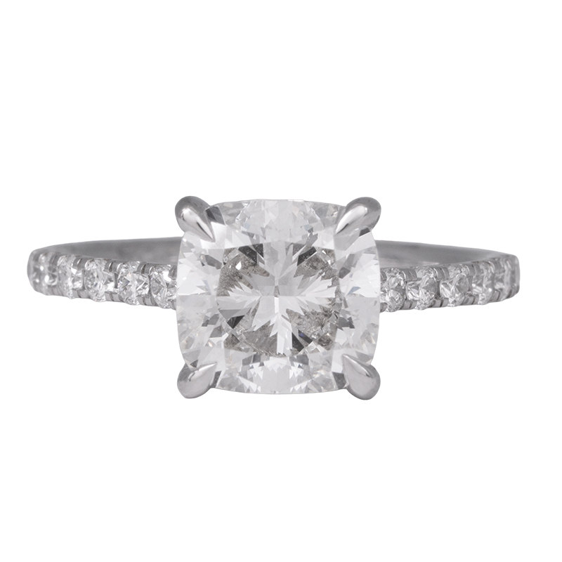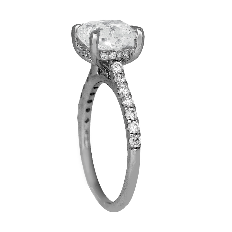 New 14k white gold under-halo engagement ring centered with a 3.06 carats lab-grown cushion diamond surrounded by 0.38 carats of lab-grown round brilliant diamonds in the under-halo & band.