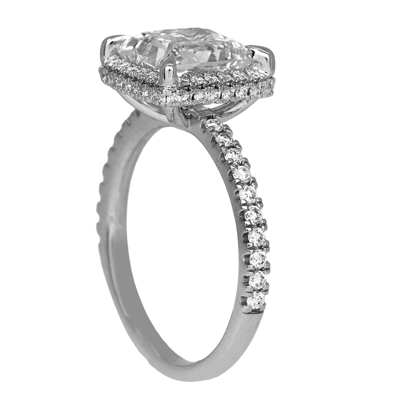 New 14k white gold halo engagement ring centered with a 3.09 carat lab-grown princess diamond surrounded by 0.38 carats of lab-grown round brilliant diamonds in the halo & band.