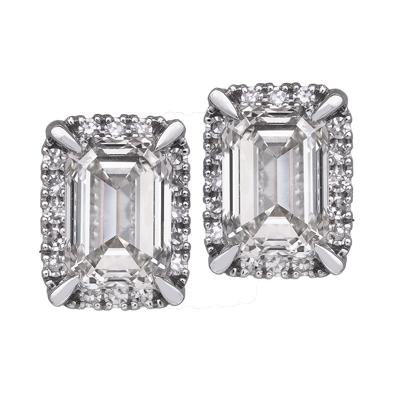 New 14k white gold earrings set with 3.64 carats of lab-grown emerald cut diamonds surrounded by 0.38 carats of lab-grown round brilliant diamond haloes.
