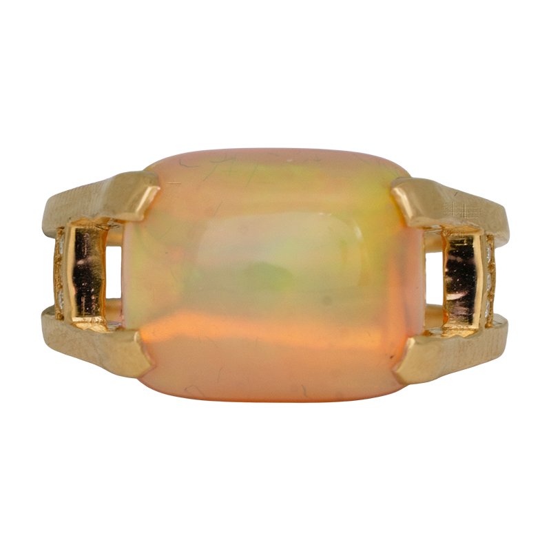 New 18k yellow gold ring set with a 4.50 carat cushion Ethiopian opal & 0.02 carats of round brilliant diamonds.
