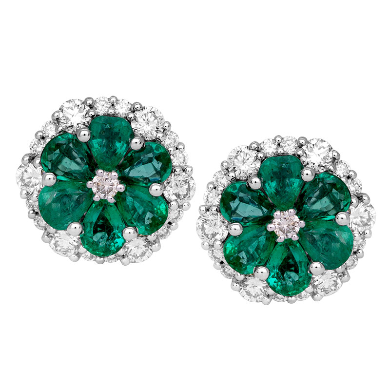 New cluster flower earrings set with 3.09 carats of pear emeralds & 1.59 carats of round brilliant diamonds.