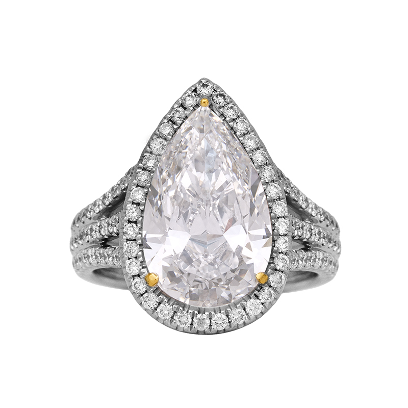 Vintage 18k white & yellow gold halo engagement ring centered with a 5.28 carat lab-grown pear diamond surrounded by 0.83 carats of lab-grown round brilliant diamonds in the halo & band.