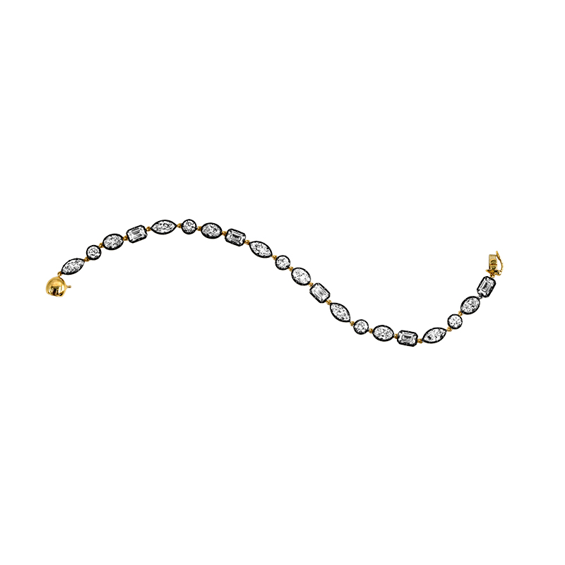New 14k yellow gold & black rhodium tennis bracelet set with 8.13 carats of lab-grown marquise, oval, emerald, and round brilliant diamonds.