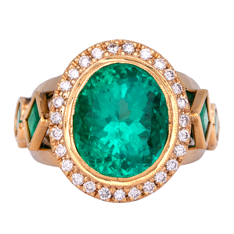 New 18k yellow gold halo ring centered with a 6.31 carat oval Colombian emerald surrounded by 0.37 carats of round brilliant diamonds & 1.63 carats of square & round brilliant emeralds.