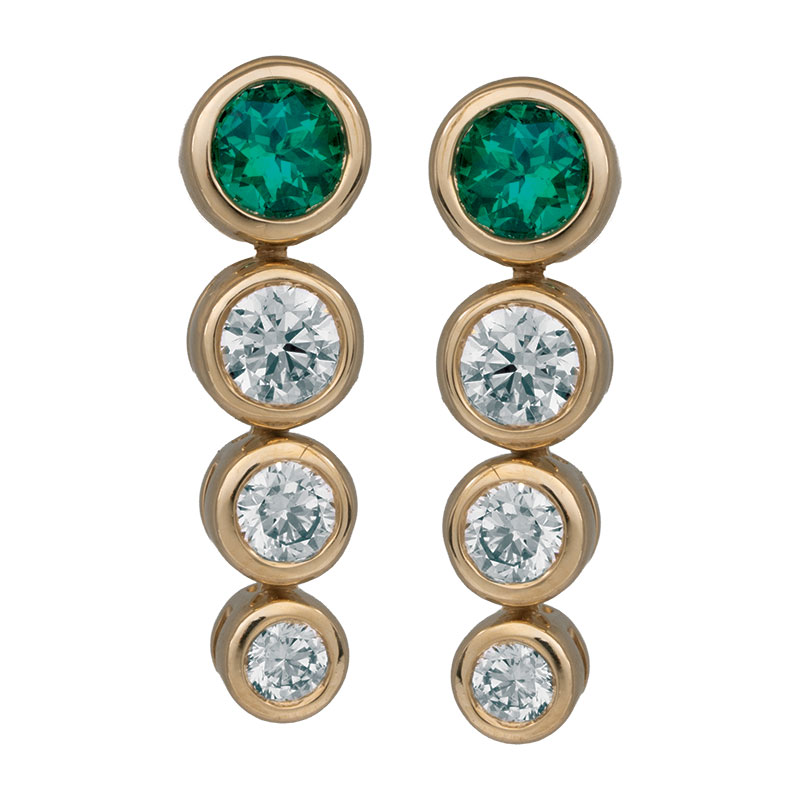 New 14k yellow gold Chatham drop earrings set with 0.46 carats of lab-grown round brilliant emeralds & 0.72 carats of lab-grown round brilliant diamonds.