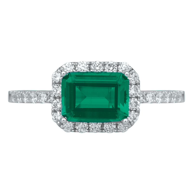 New 14k white gold Chatham halo ring centered with a 1.20 carat lab-grown emerald cut emerald surrounded by 0.38 carats of lab-grown round brilliant diamonds.