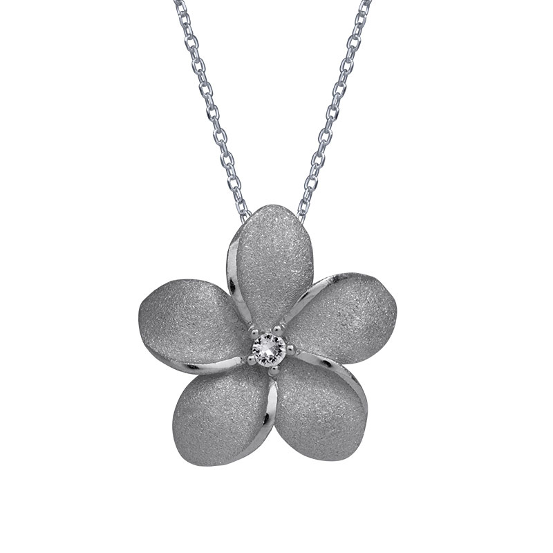 New sterling silver Denny Wong Plumeria pendant set with a 0.08 carat round brilliant white sapphire.