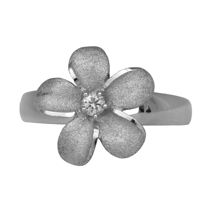 New sterling silver Denny Wong Plumeria ring set with a 0.12 carat round brilliant white sapphire.