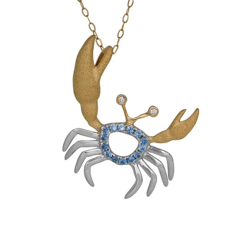 New 14k yellow & white gold Denny Wong Crab pendant set with 0.13 carats of round brilliant pastel blue sapphires & 0.01 carats of round brilliant diamonds.