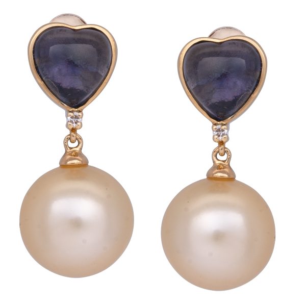 New 18k yellow gold Denny Wong earrings set with 10mm golden South Sea pearls and 2.18 carats of cabochon iolite hearts.