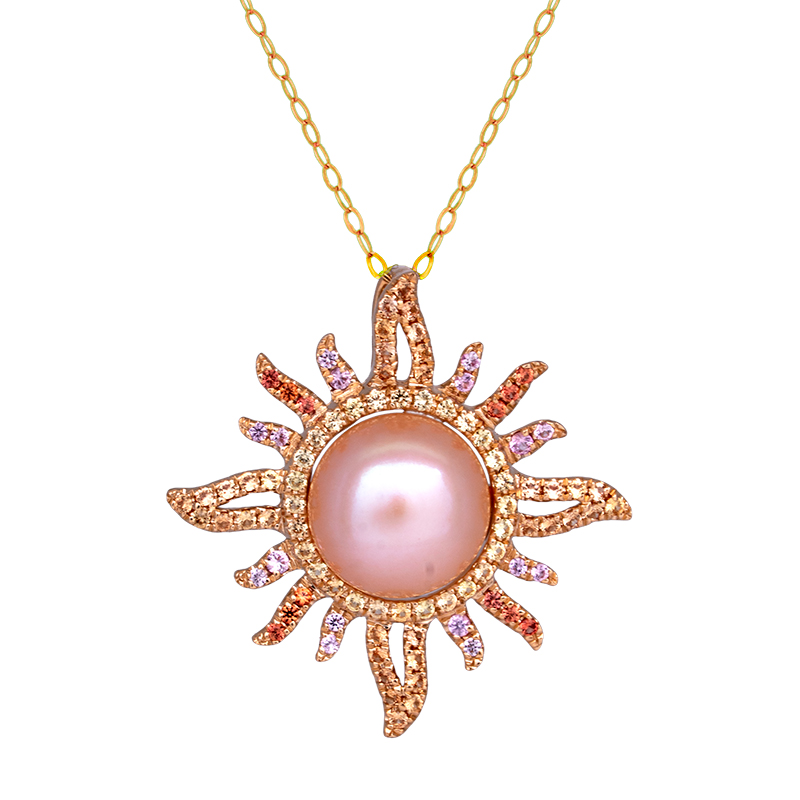 New 14k yellow gold Denny Wong Sunburst pendant centered with a 9mm freshwater pearl surrounded by 0.58 carats of round brilliant pink, orange, and yellow sapphires.