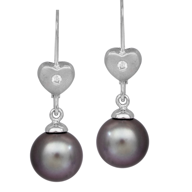 New 14k white gold Denny Wong drop earrings set with 8mm Tahitian pearls & 0.03 carats of round brilliant diamonds.
