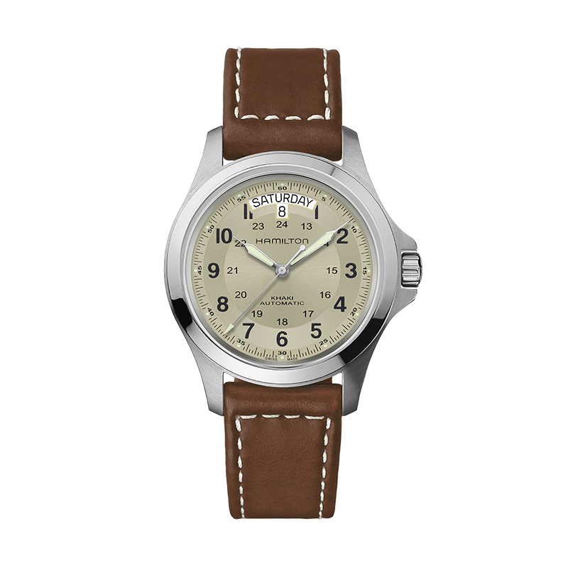 New Hamilton Khaki Field King watch, 40mm in stainless steel with a beige dial, sapphire crystal, brown leather strap, tang buckle, and automatic movement.