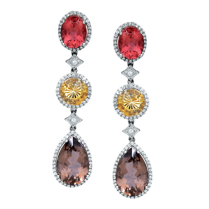 New 18k white gold Judy Mayfield halo drop earrings set with 19.70 carats of oval tourmaline, round citrine, and smokey quartz with 0.98 carats of round brilliant diamond haloes.
