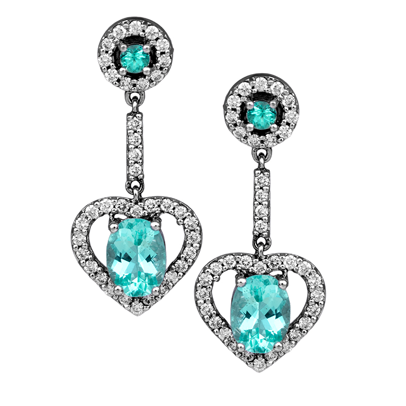 New 18k white gold Judy Mayfield heart halo drop earrings set with 2.84 carats of oval & round brilliant Mozambique Paraiba tourmaline surrounded by 0.81 carats of round brilliant diamonds.