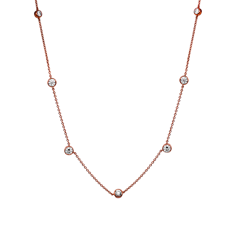 New 18k rose gold Memoire station necklace set with 1.01 carats of round brilliant earth-mined diamonds on an 18″ chain.