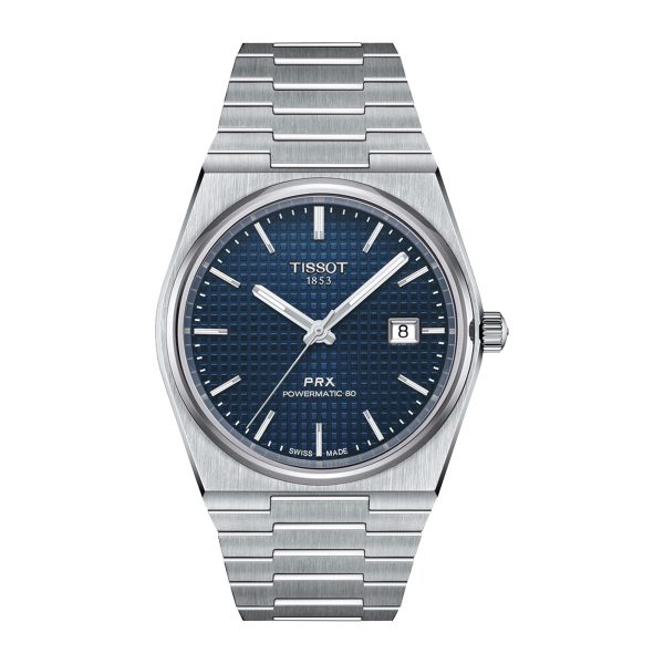 New men’s Tissot Powermatic 80 watch, 40mm in stainless steel with a blue-to-black gradient dial, sapphire crystal, folding clasp, and automatic movement.