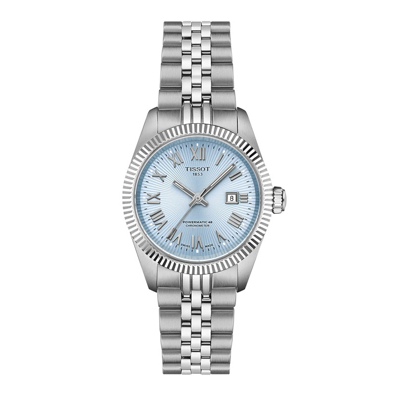 New Tissot Ballade watch, 30mm in stainless steel with an ice blue dial, fluted bezel, sapphire crystal, folding clasp, and automatic movement.